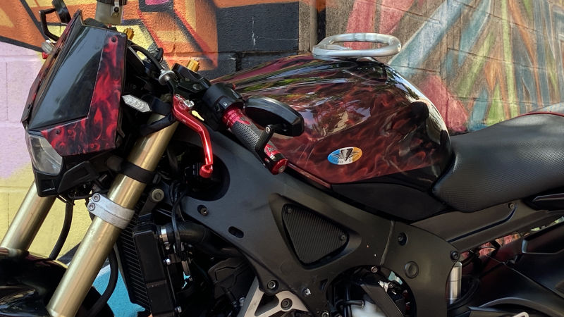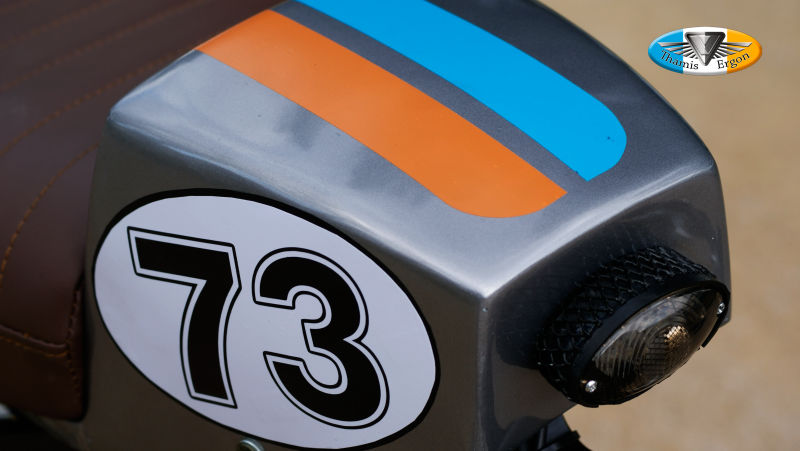 Un colín de competición modificado para el cliente y una buena mano de aerógrafo en el depósito y careta es la clave de esta moto..